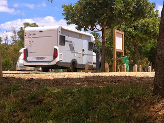 Paragem seguinte, o parque do alambre em plena área protegida da Serra da Arrábida para um aprazado almoço com um casal amigo autocaravanista que já estava pontualíssimo e à espera às 12.30h. Restaurante fechado! -Paciência, seguiram as duas autocaravanas para o restaurante mais próximo, e na esplanada ao ar livre, sardinhas e febras q.b...e boa da conversa ate as 15h. Despedidas feitas e GPS orientado para a Barragem do Vale do Gaio, que assim rebatizou a original denominação da Barragem Engº Trigo de Morais, só por ser do "ancien regime.."